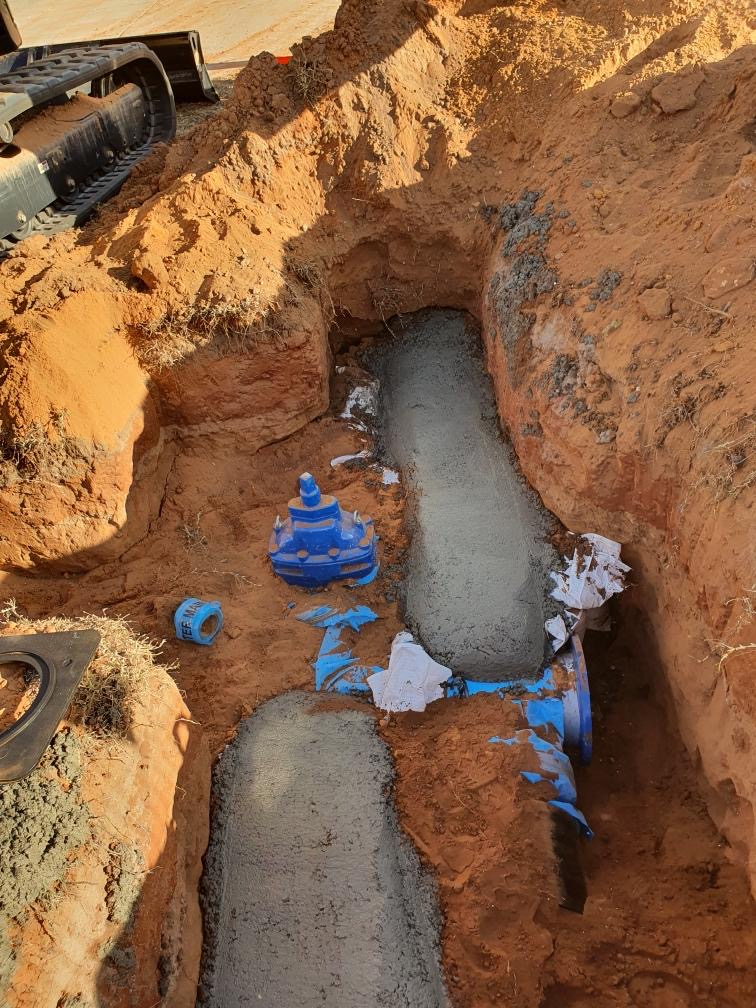 Supply and install a total of 500m of 100mm PVC-M water main and 220m od 150mm PVC-M water main a 315mm PE under bore across Middle Street and a 250mm Valve set installation, to allow connection of future works, this work was completed along the road reserve, under a shoulder closure, this was an upgrade to the failing existing AC water main along these streets.